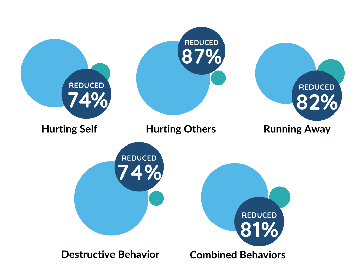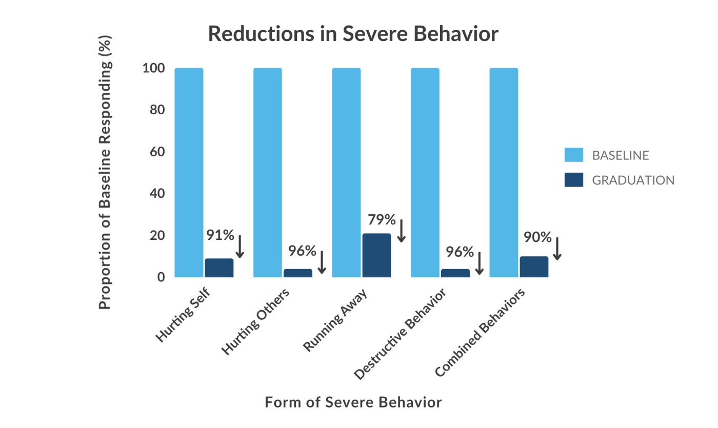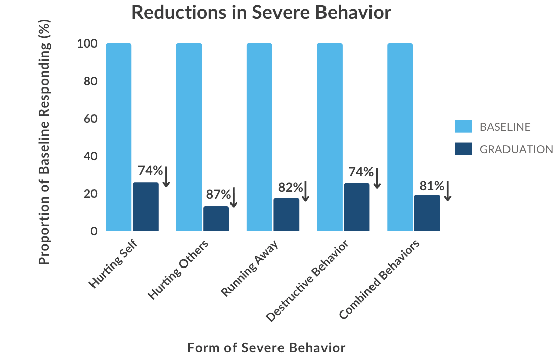 On average, children demonstrated an 81% reduction in severe behavior by the time they graduated from treatment, meaning that behaviors occurring at admission were reduced to less than one‑fifth of their original levels.
